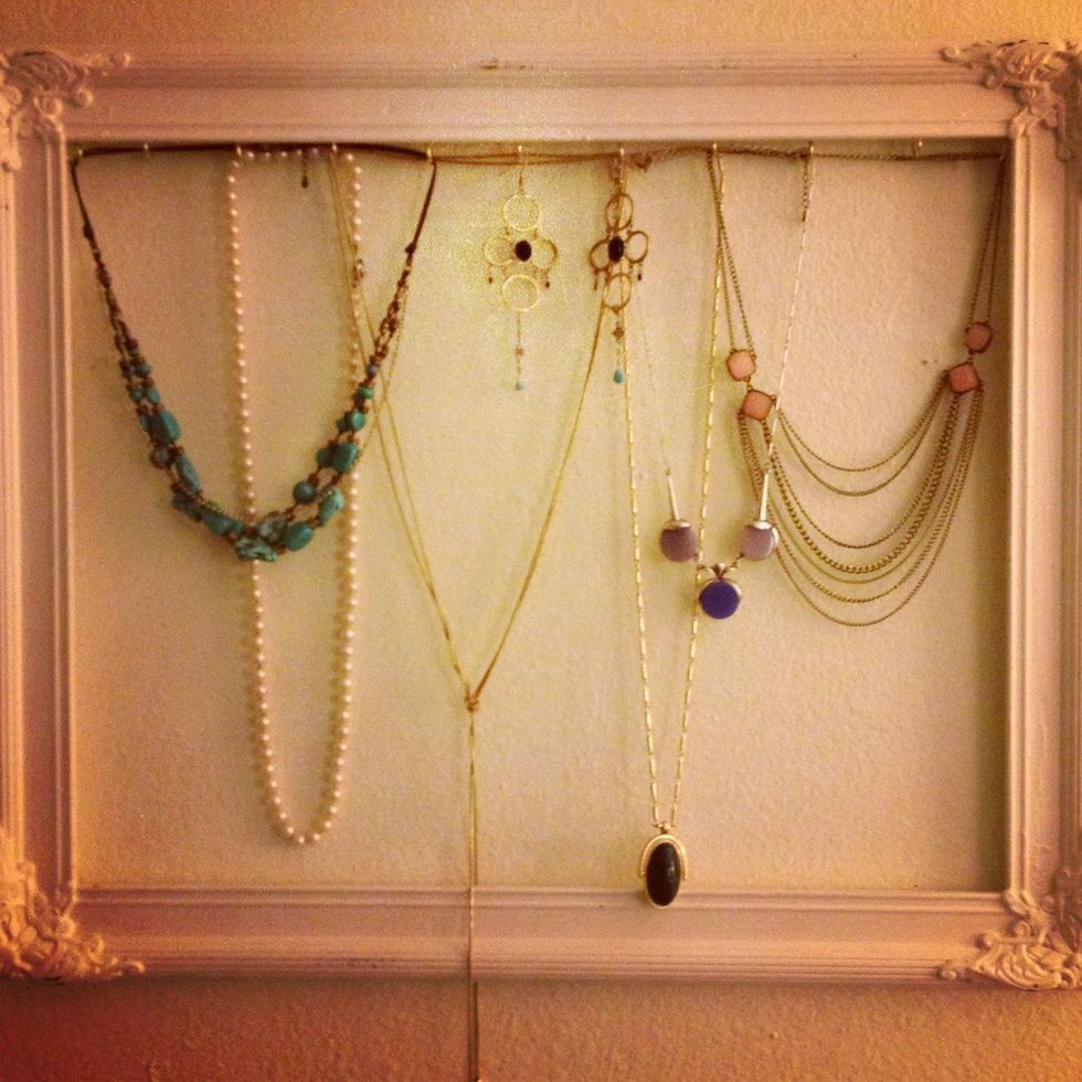 Hang your jewelry on the hooks and the frame on the wall. You can also put a piece of cardboard wrapped in pretty paper in the frame as a nice backdrop to the jewelry.