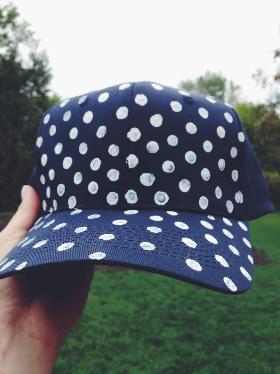 Begin evenly dotting your baseball cap to create a pattern. I placed the rows equally apart and centered lower dots between the row above. Try to keep this uniform pattern all around the cap.