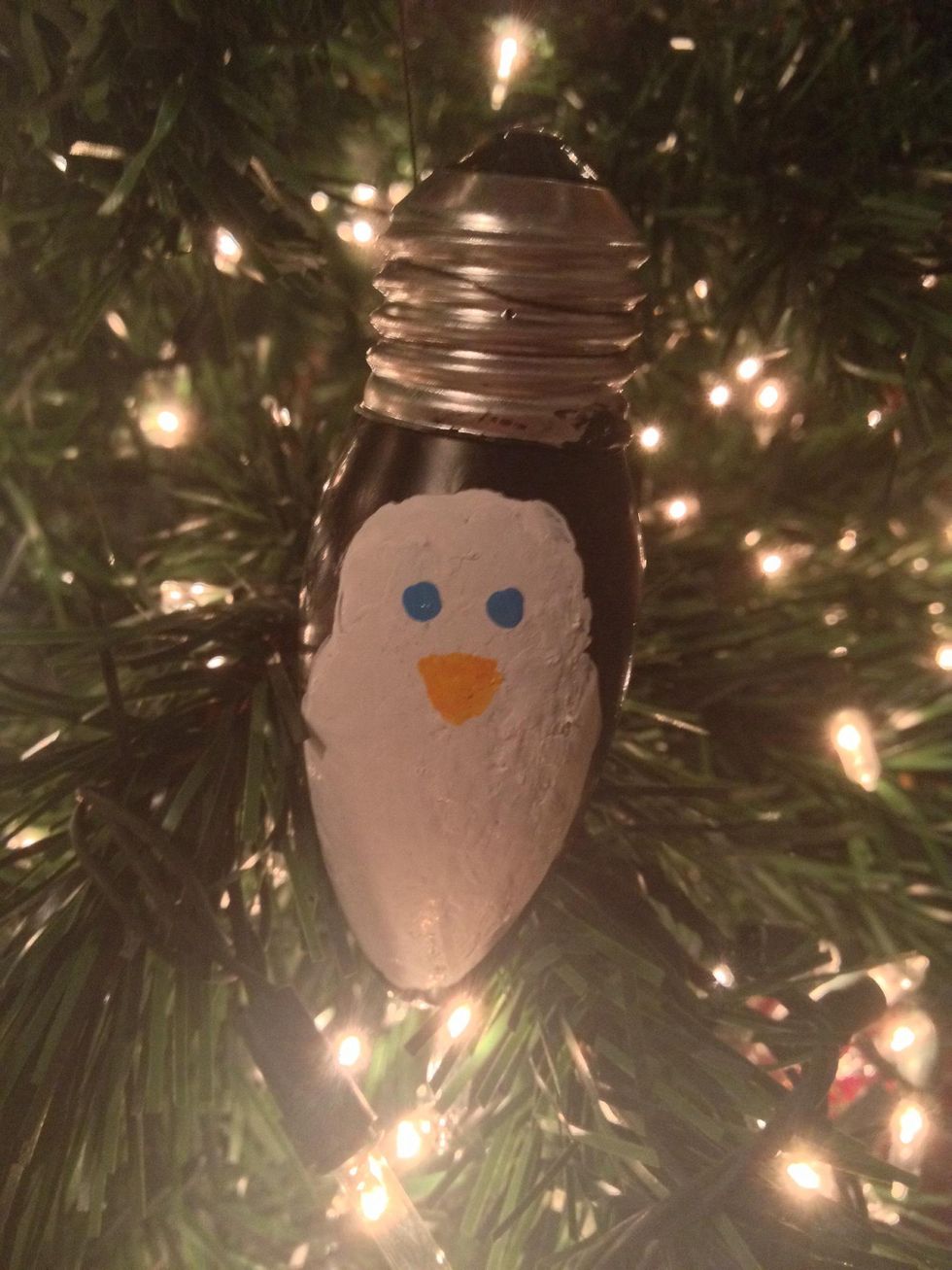 Now that your lightbulb is completely dry, with the paintbrush paint a penguin body with the white color and we are almost done!