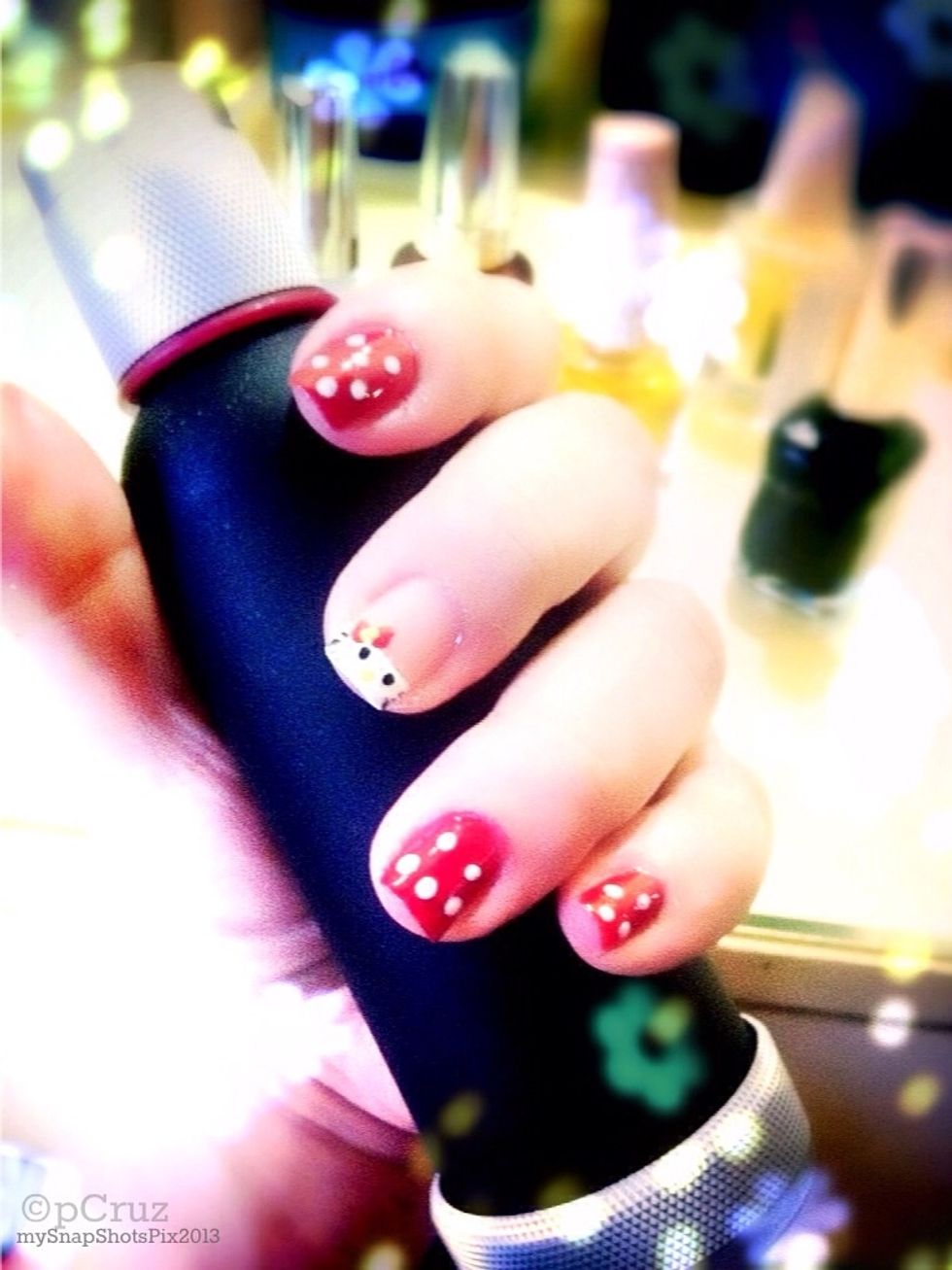 See the photo. About the red nails also use the ear buds (sharp edge) dip in white polish and make dots on the top of the red polished fingers (see photo)