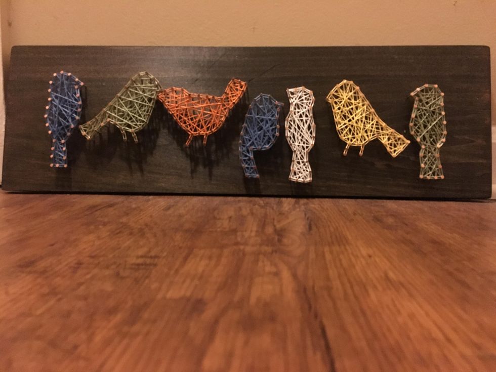 I chose to make my birds different colors. You can get any color embroidery thread you want. I tied a know of the string to one of the nails and started from there.