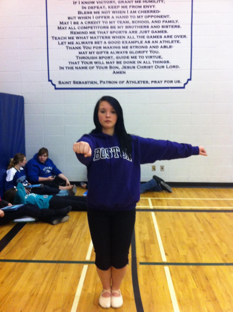 Your arms will usually start here. Your right out straight in front of you, and your left out beside you. Keep your arms straight and strong whole spinning.