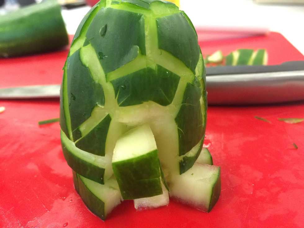 First cut a thin line close to the bottom of where you cut your cucumber. Next you have to cut an outline of a pentagon in the top and make your way down.