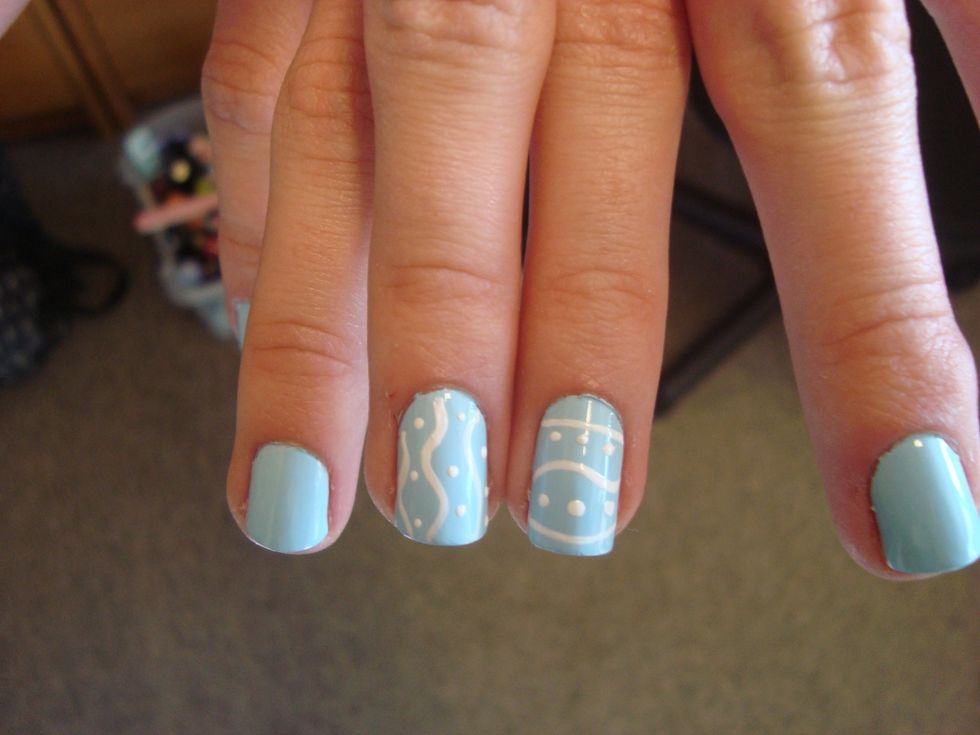 Start with a squiggle line across the center of one nail. You can do all, I just prefer one.