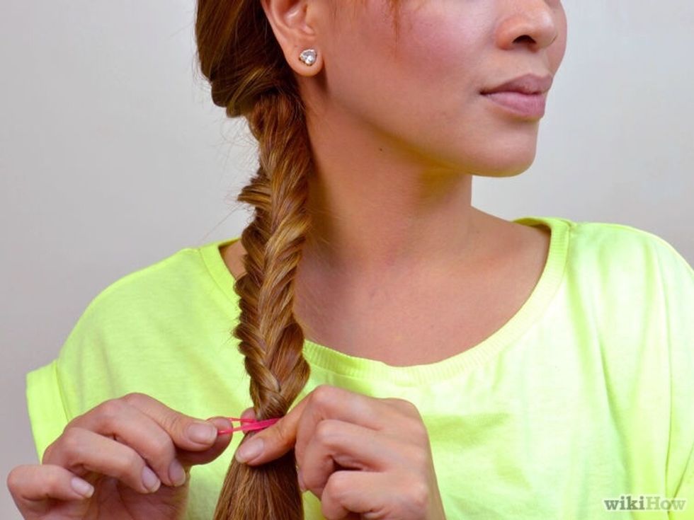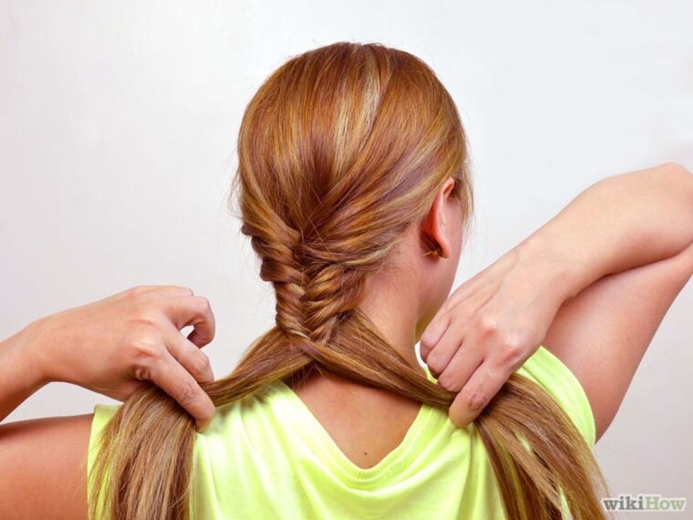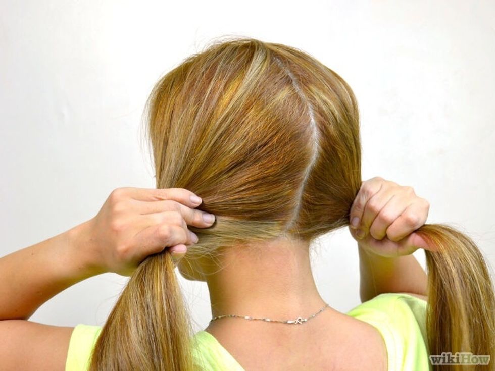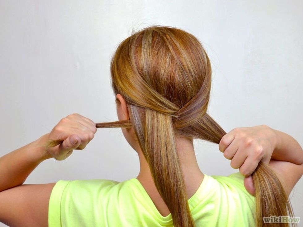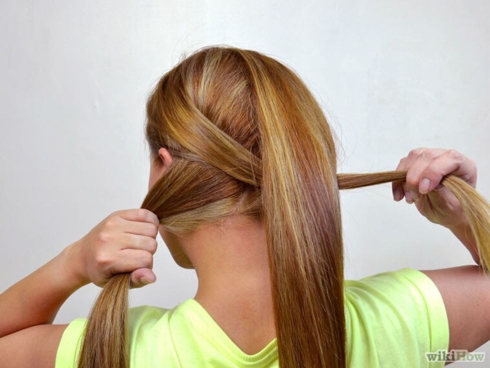 Gather a thin strand of hair from the outside of the left section of hair. Pull it over the top of the left section, and hold it under the right section of hair.