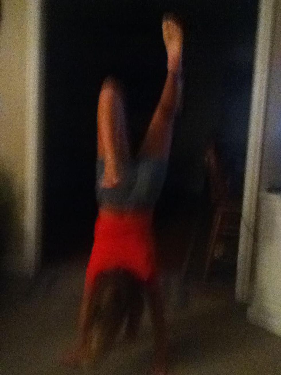 Put ur feet shoulder length apartLunge forward like u r about to do a handstandThen do a hand stand with ur legs bent an lean forwardWhen u first do this u will need someone to help u!