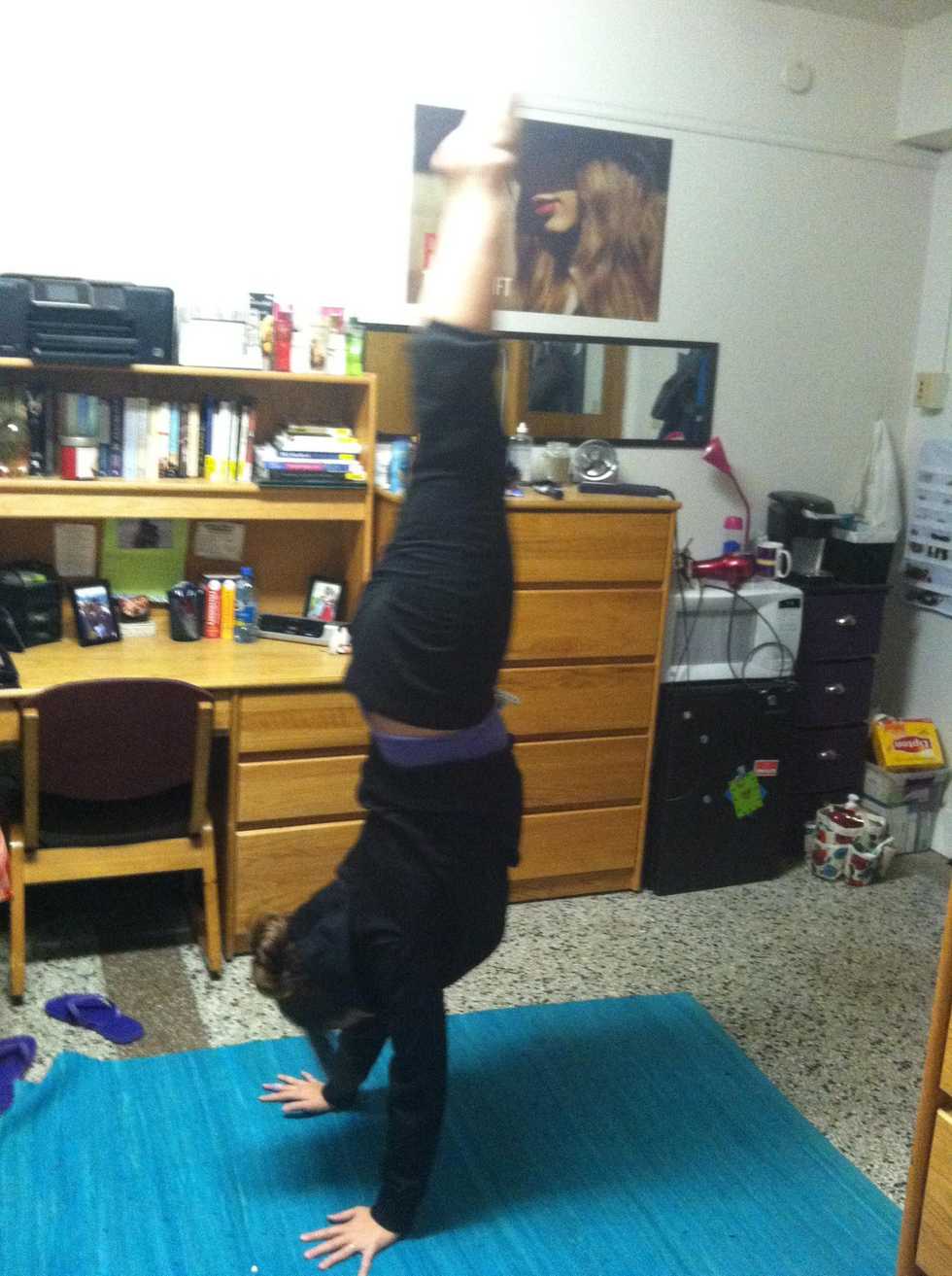 Be sure to wear loose, comfortable clothing when performing a handstand. When properly dresses, begin by pointing your dominate foot in front of you.