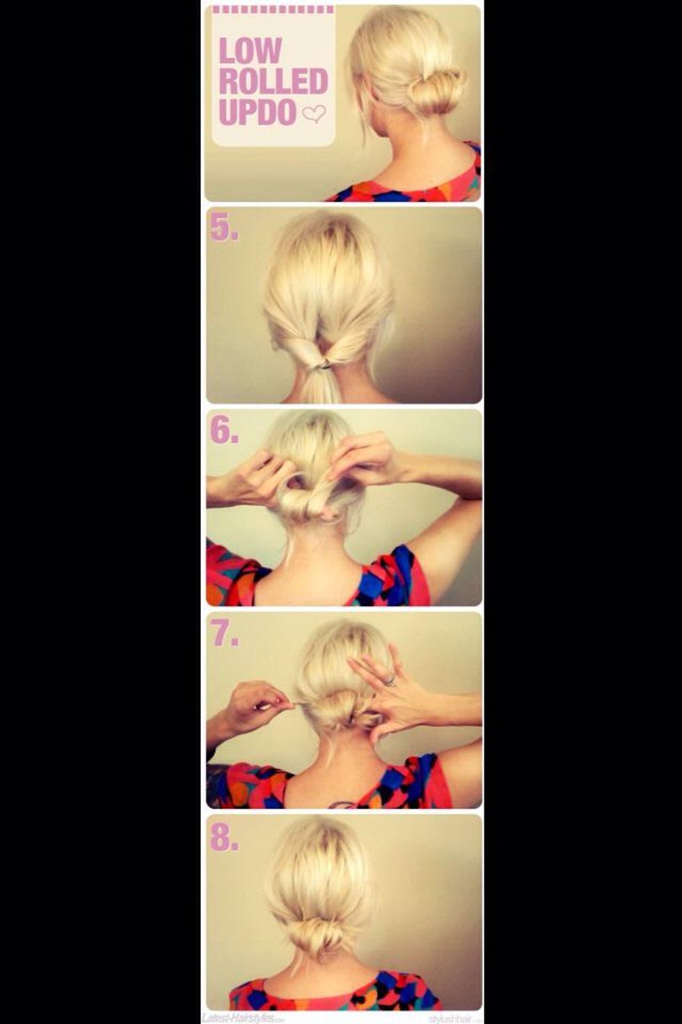 Low rolled updoPut a loose ponytail in the back and flip it underKeep flipping the rest of your hair under again and againTake the bony pins and pin them in your bun to hold it upAll done