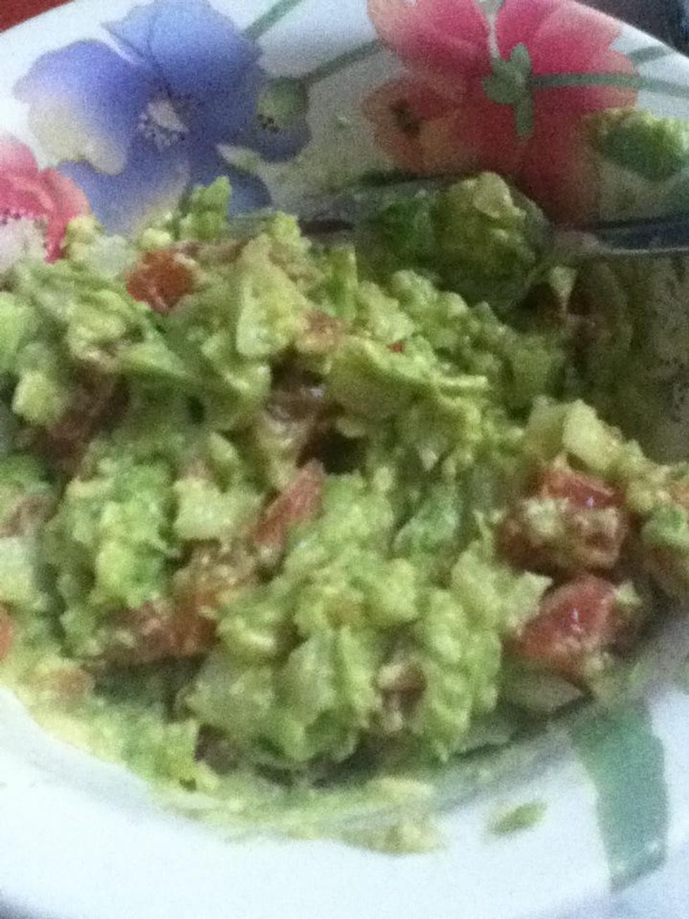 You Will need, avocado, tomatoe, onion, a lemon, coriander and green Chile.First cut the avocadoNext Chop the tomatoeLike thisAdd the half of a lemonChop the onionThen Chop the corianderAnd the ChileTadaaa!! 😊👍Enjoy It!!