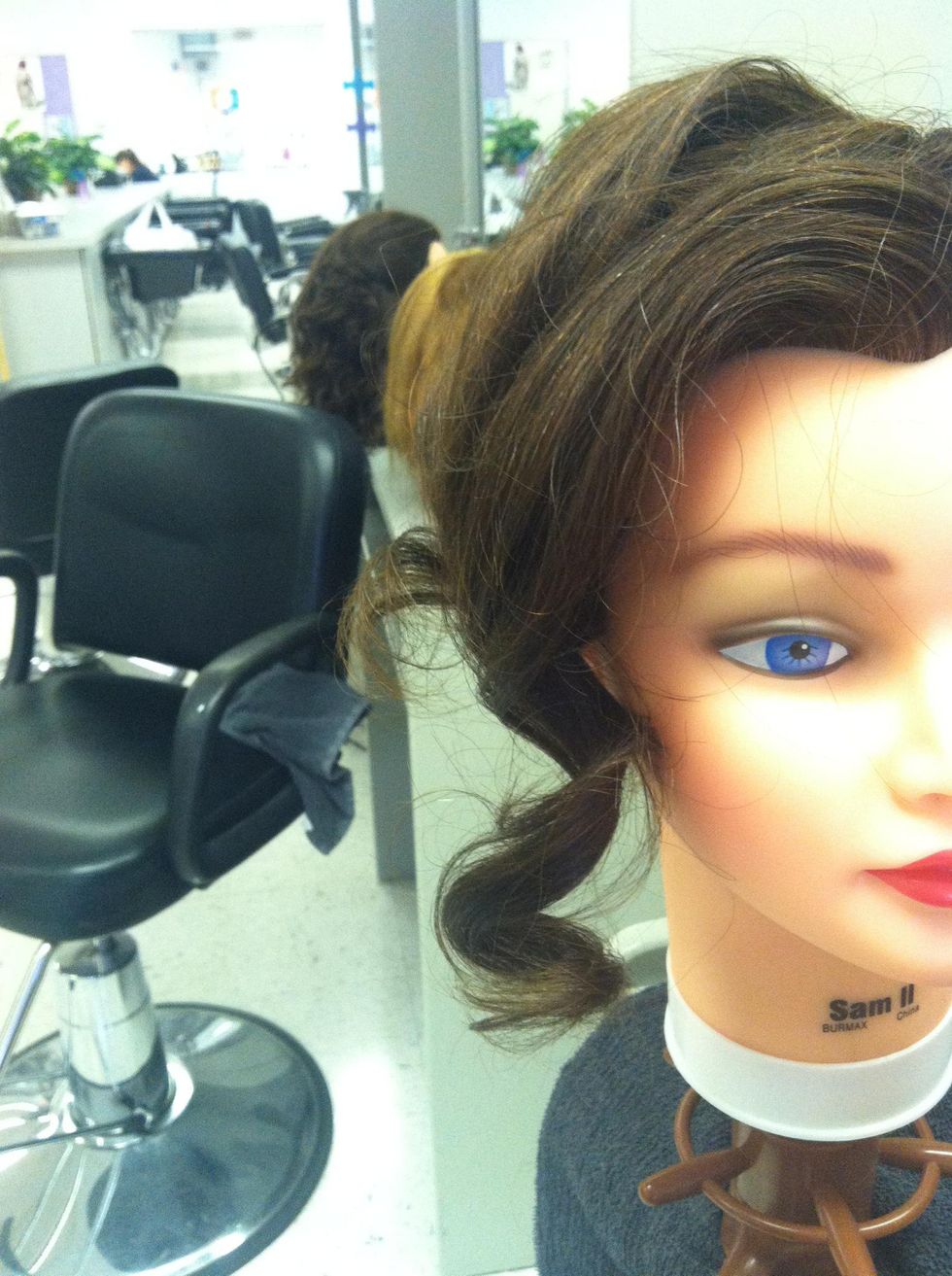 Continue rolling, and spray every curl with hair spray, in the same direction. It should look like this at first. (i didn't have time to finish) & after you finish the whole head, give a final spray.