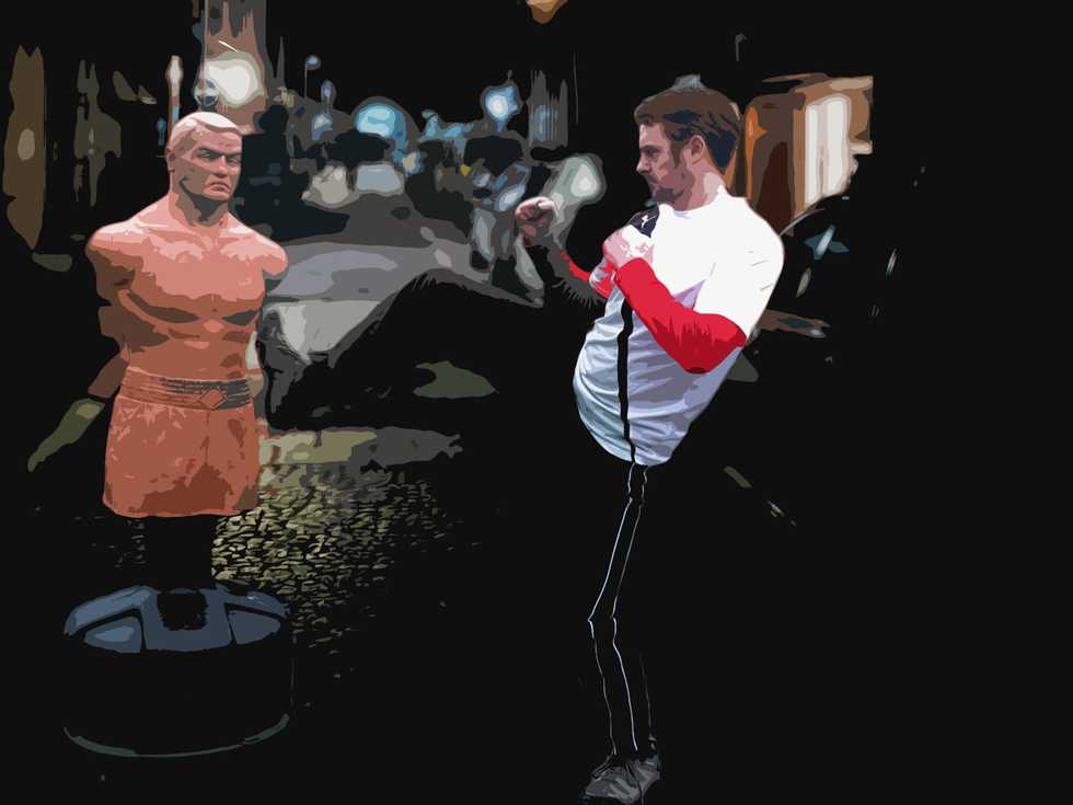 Begin in a side on stance, feet two shoulder widths apart, with the kicking leg back. Feet should be parallel, pointing slightly to the side. Keep the guard up throughout.