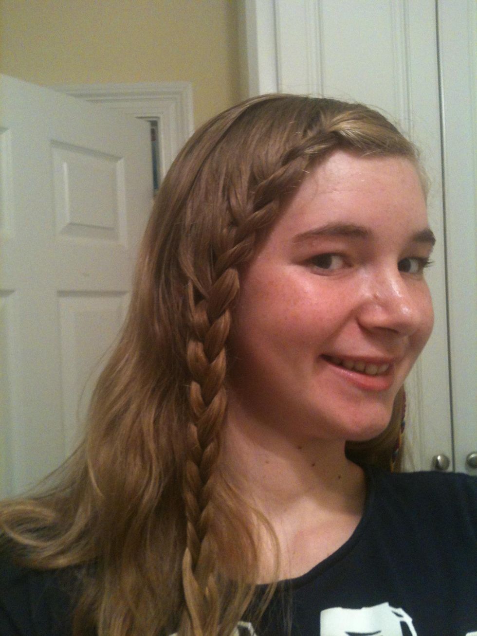 Srry for the bad pic! Just take a piece of hair and cross it over a couple times like a regular braid. I'm using the front part of my bangs. Bigger piece=bigger braid