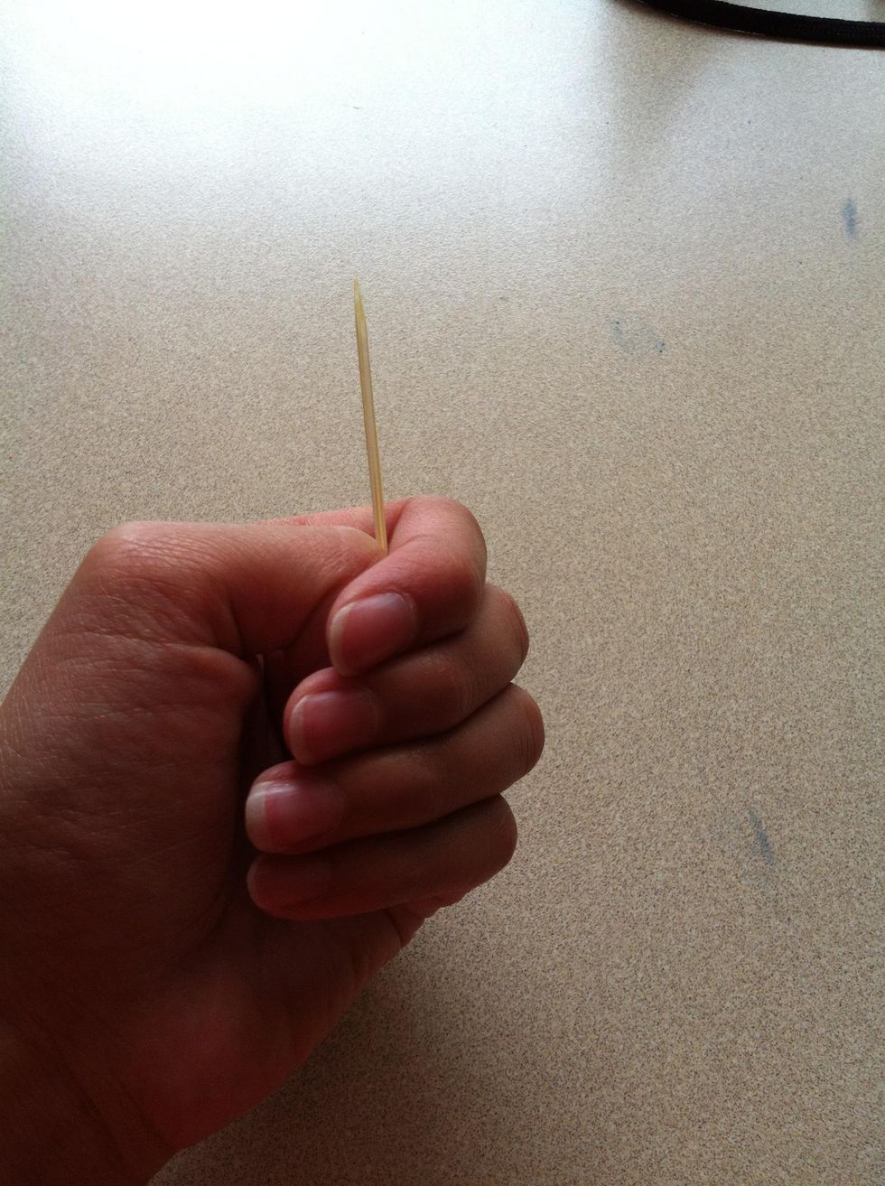 You can take the toothpick out of your hands after the trick and tell the audience to examine it while they are examining you can quickly take the blue tack off so you can show them your hands as well