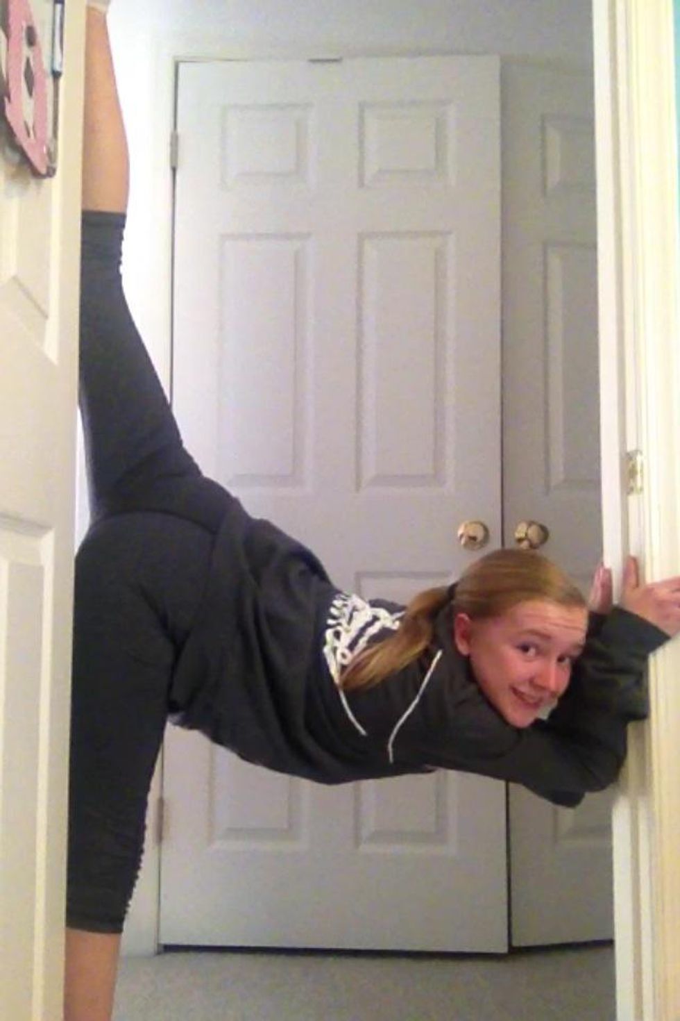 Figure out what foot your better at doing splits with. Mine is the right. The foot your better at put/keep on the floor and left the back foot to put on the wall/door.