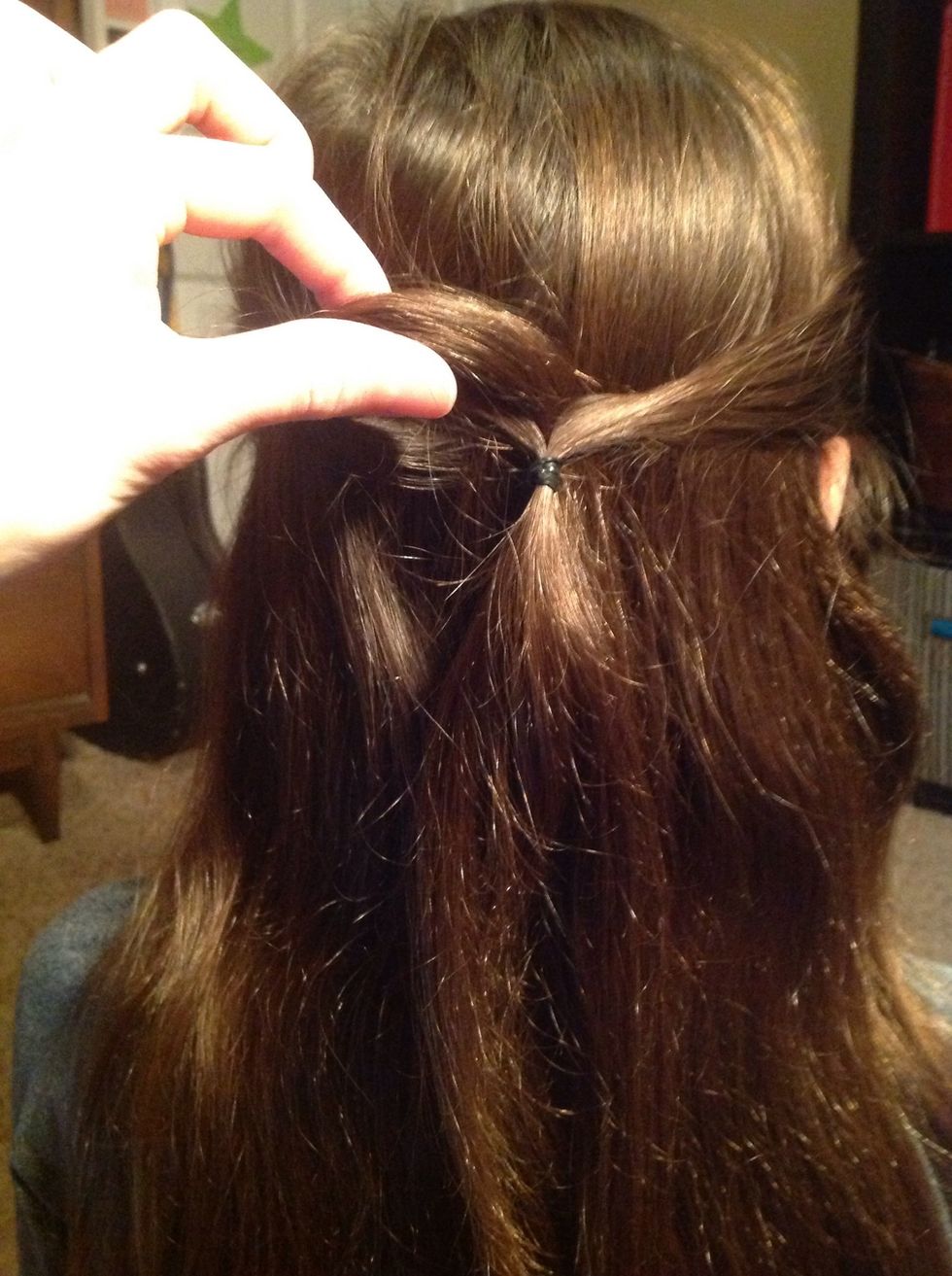 Take an inch or so of hair right above each ear, and fasten them together loosely with the hair tie.