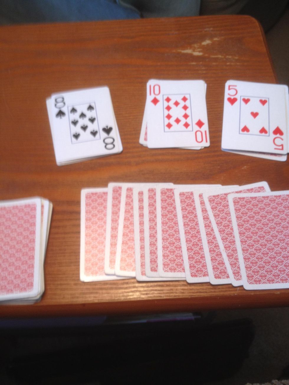 Make sure all stacks face down, making note where your leftovers are, mine are bottom left. However many stacks are left, ask someone to eliminate any number of random stacks so only 3 piles remain.