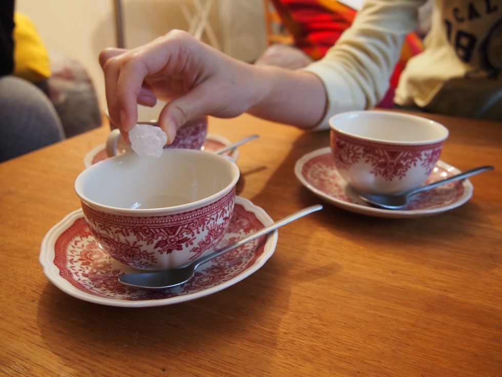 Place 1-2 Kluntjes (white rock sugar) into the teacups.