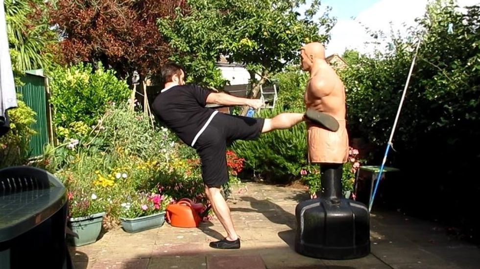 As you prepare to twist the foot into the kick, lift the standing heel. Your are on the ball on the foot at this stage to prevent wrenching of the knee. Keep the body buoyant and avoiding slouching.