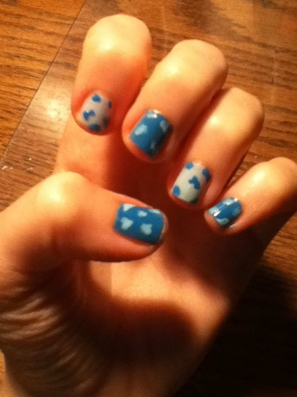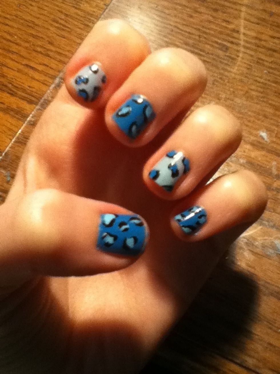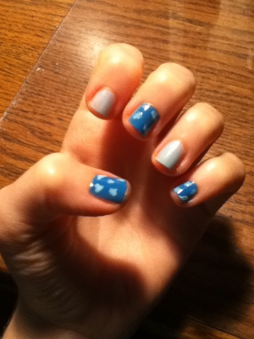 Next, take the light blue and paint small splotches on the nails coated with dark blue. It doesn't have to be perfect! Let it dry completely.