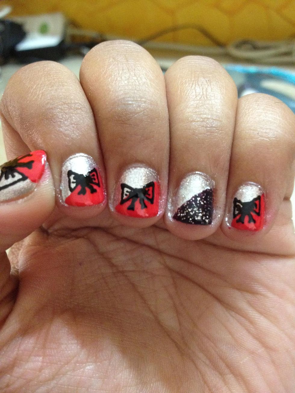 Wait for it to dry and then paint half your nail diagonally with your colour. Here, I have used light red and dark purple on my ring finger.