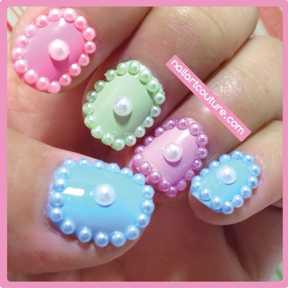 Pick pearls of the same color. Use a dotter, dab a dot of clear coat on the border of your nail. Use the dotter to pick up a pearl and place it where you placed the clear coat dot.