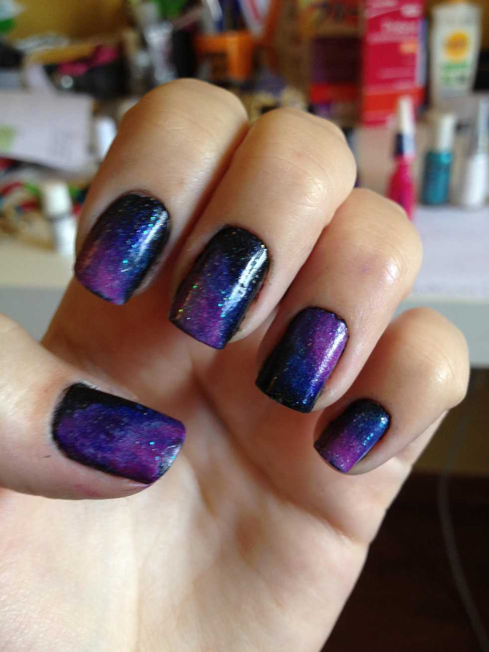 Add the light blue and the pink ( my pink polish was matte, that's why it looks weird)