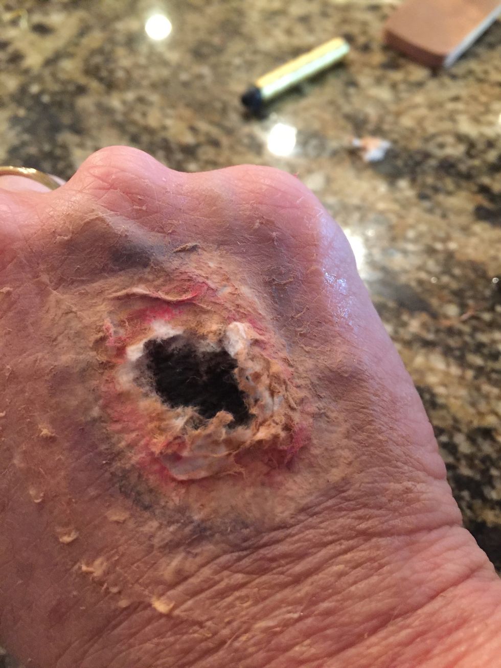Take the black make-up pencil, and apply it in the middle of the wound.