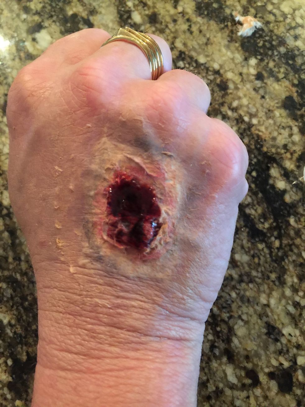 Turn the hand side to side, so it looks like the blood dripped naturally.