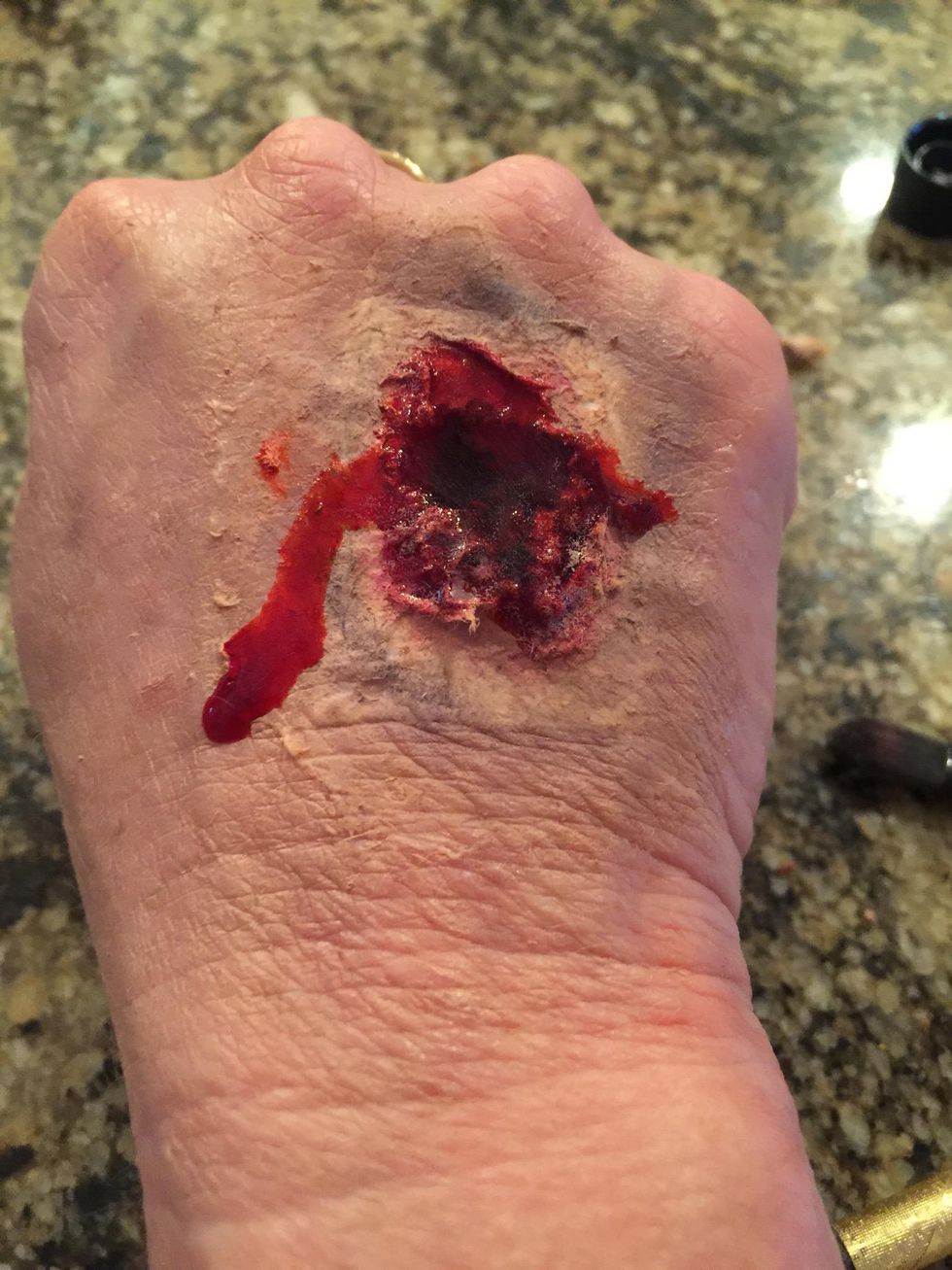 Spray the artificial blood, and spray it in the middle of the wound.