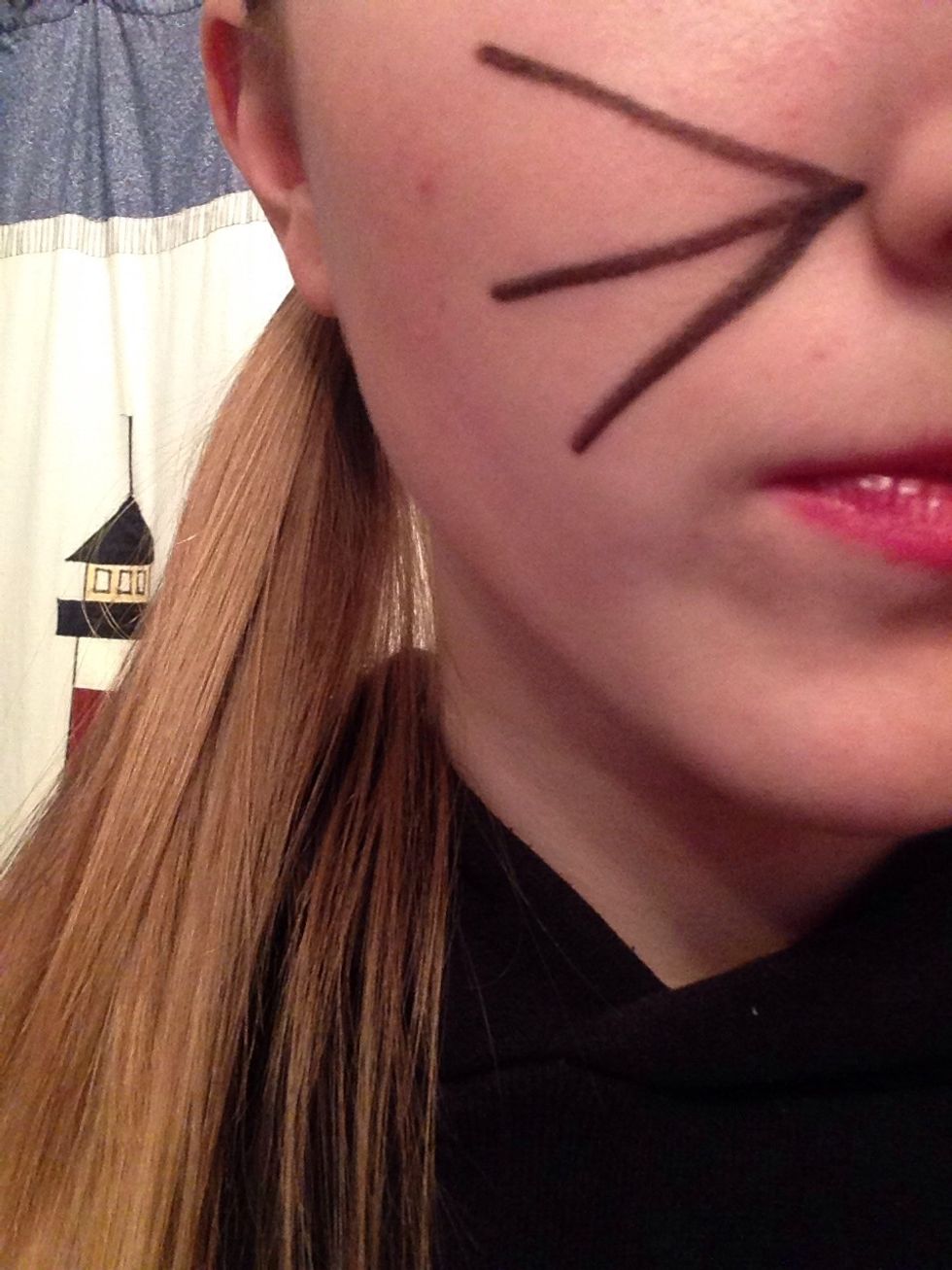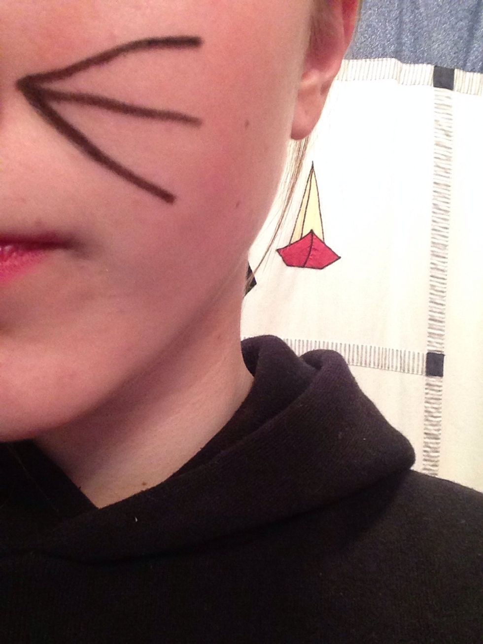 Take your black eyeliner and draw a > on your left cheek and after that draw a line right in the middle of this >