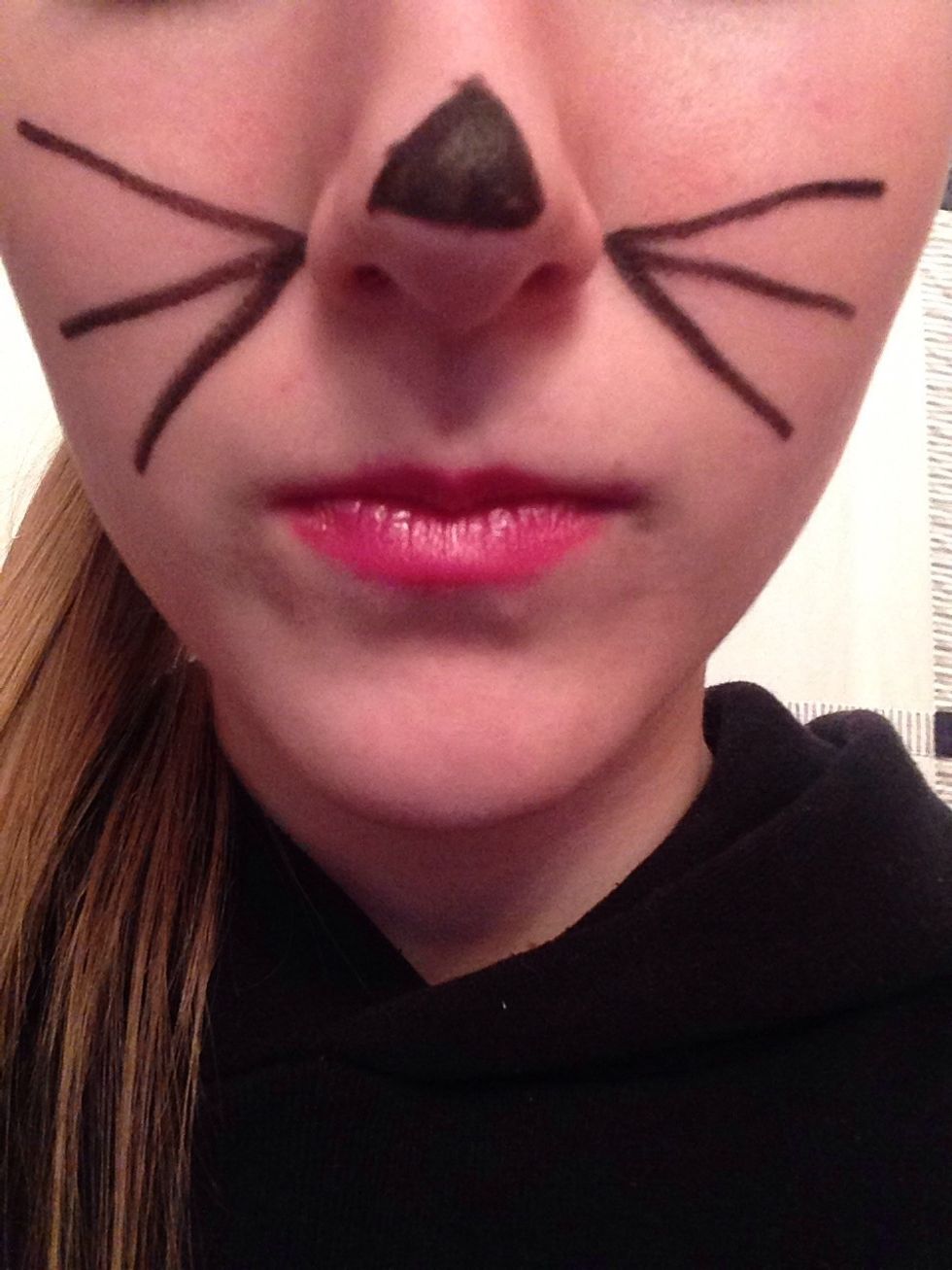 After that with your black eyeliner draw a triangle on your nose and color it in