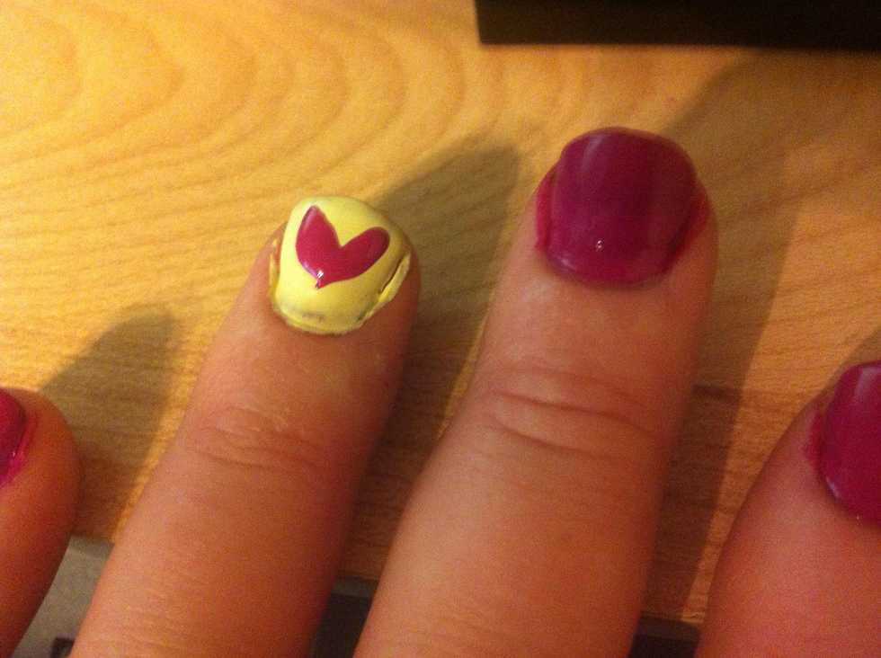 Lay the toothpick on your nail at angle. This is one side of the heart. LAY FLAT! Don't deposit a drop then drag - that makes uneven edges.