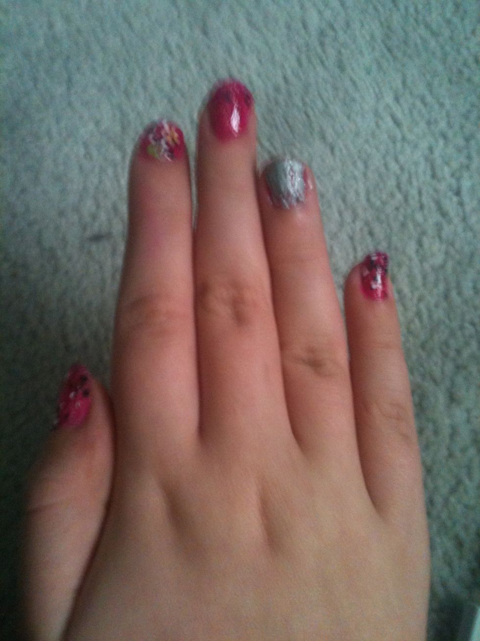 Here are the supplies that you need. Are in order. You will need a base coat ( I'm using pink), splatter type, crakle, clear sparkle, top coat, and nail stickers.