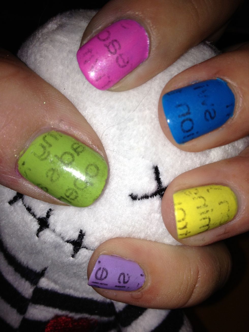 Cut some newspaper about the size of your nails. Use single words you find like "love", or black and white pictures of let's say a rose. Get creative:)