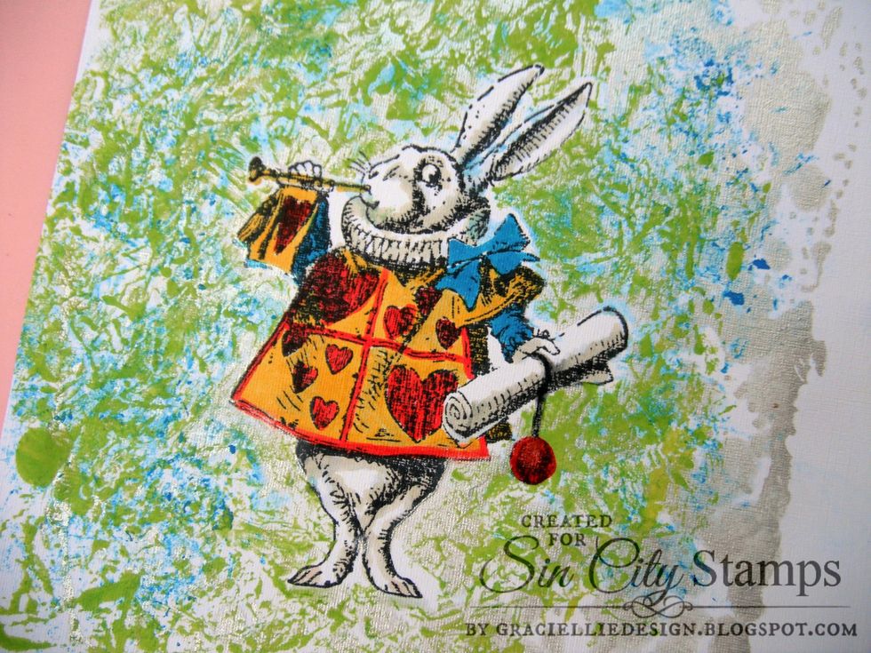 I stamped this lovely Alice in Wonderland rabbit twice. I fuzzy cut one of them to use it as a mask.