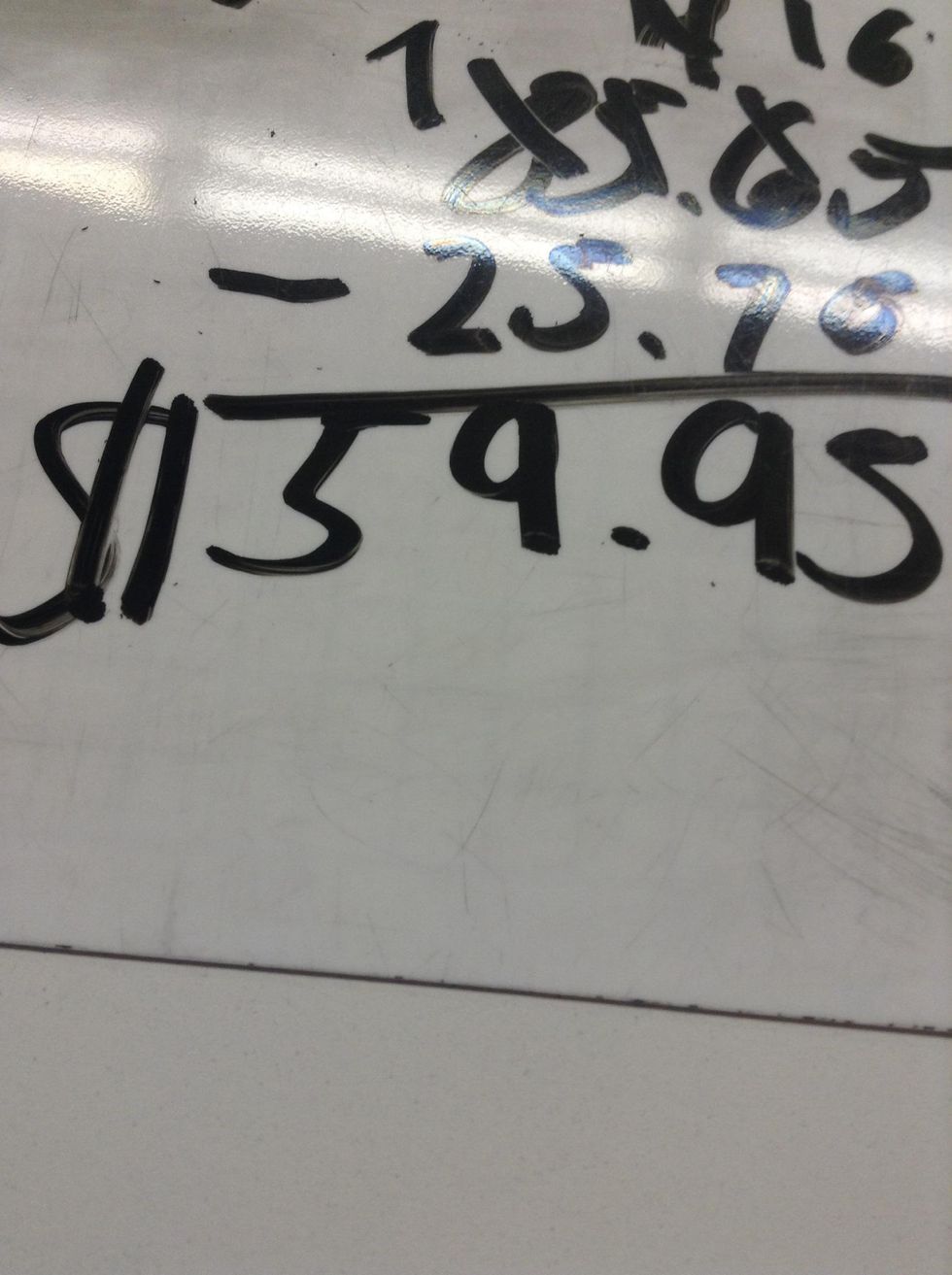 This is the problomThis is your first answer and u got $25.70Then u subract 85.65 to 25.70 and u get the answer $59.95The answer is $59.95