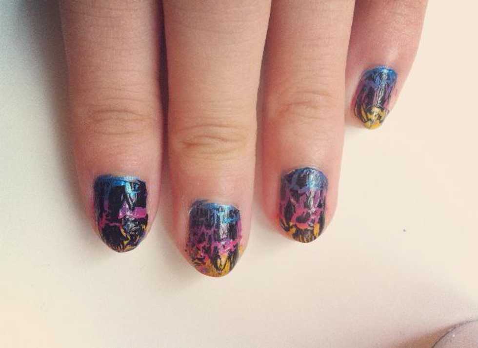 You will need 4 bottles of nail polish that create a sort of rainbow looking effect. & Top coat and a black shatter/crackle. You could also do zebra patterns if you want instead.
