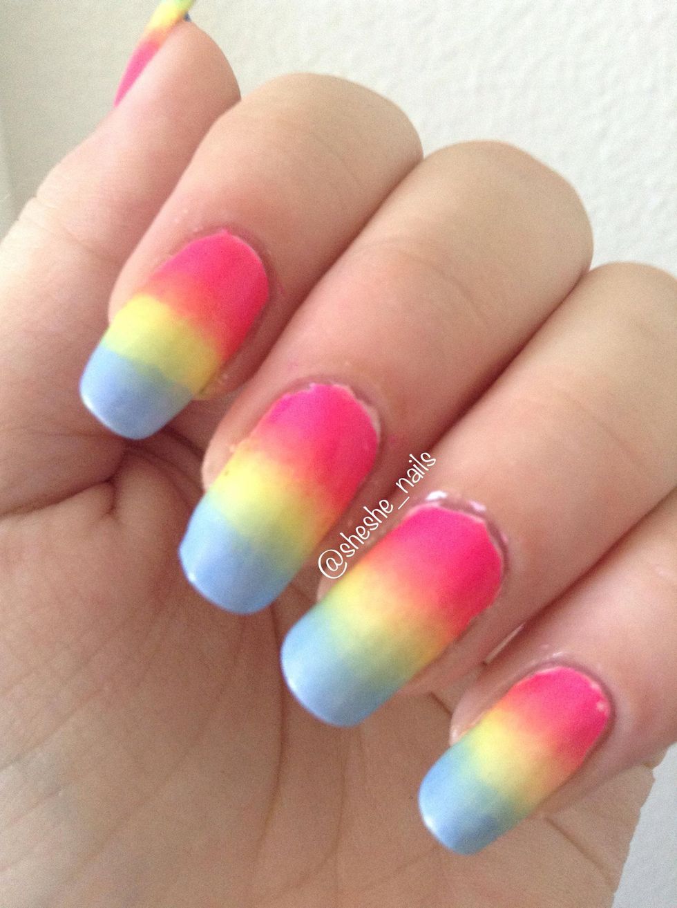 All the stuff you need. Base and top coat. Pink, yellow, and blue polish. Polish remover, a make up wedge, tin foil, and a small brush (or q-tip).
