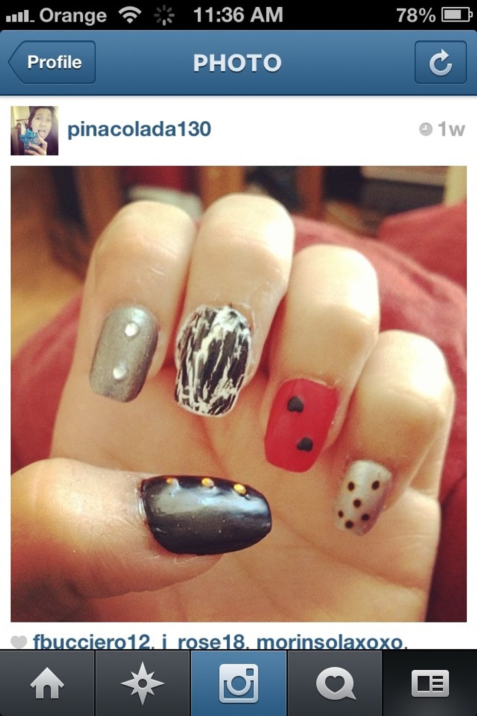 Nail polish colors (left to right): Grey, black, red, top coat, base coat.