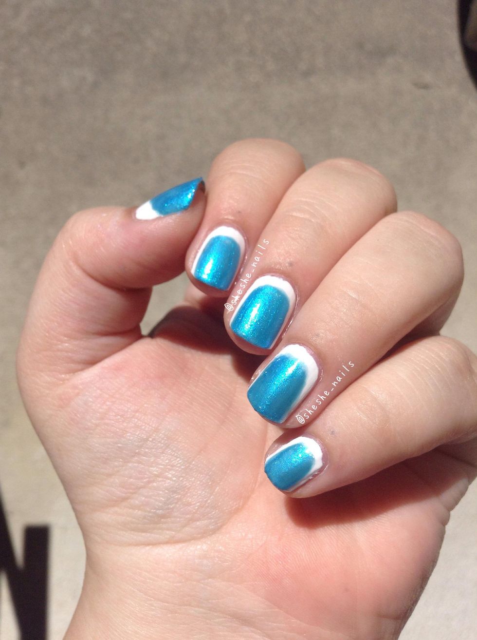 You can actually add another color, or do the first again. You can make it a double ruffian/reverse French mani. And you can so whatever colors you like. I did one with silver and light blue.