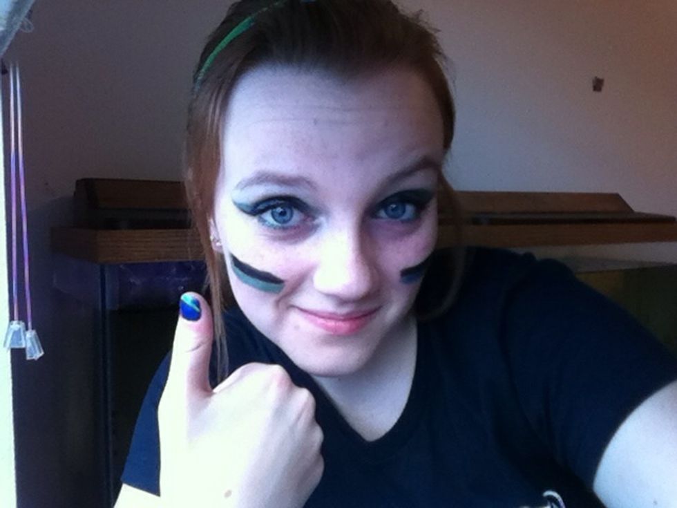 After mascara, some touch ups, and a little more fun, I came up with the following look that says Seahawks fan in one glance!