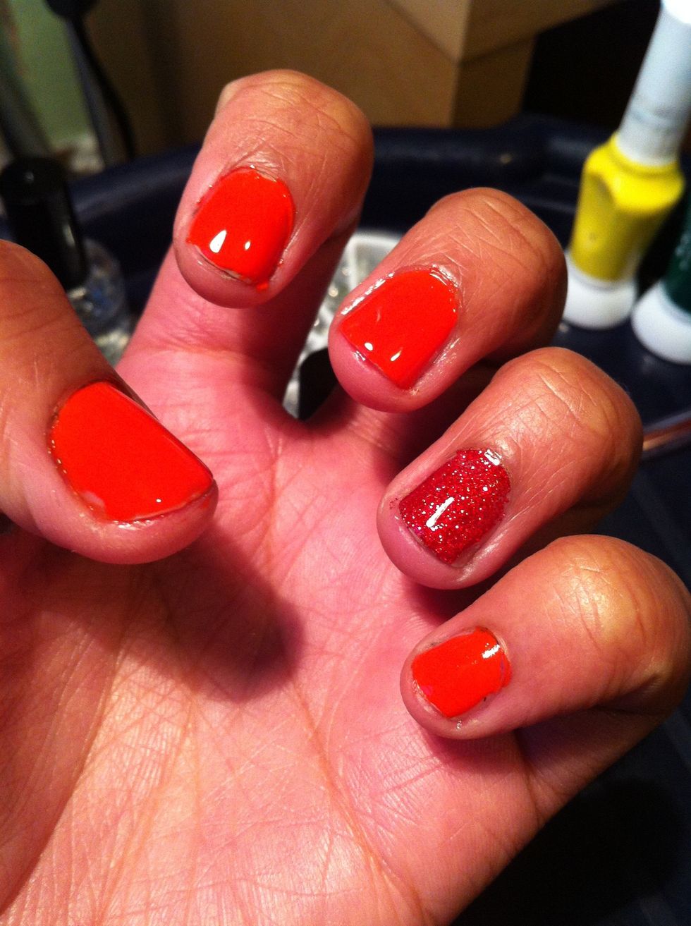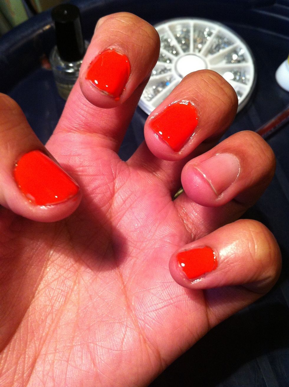 Now get your red nail varnish and paint all but one nail, I usually leave out my ring finger. This is so you can apply your glitter nail varnish if you have it if not carry on painting them all