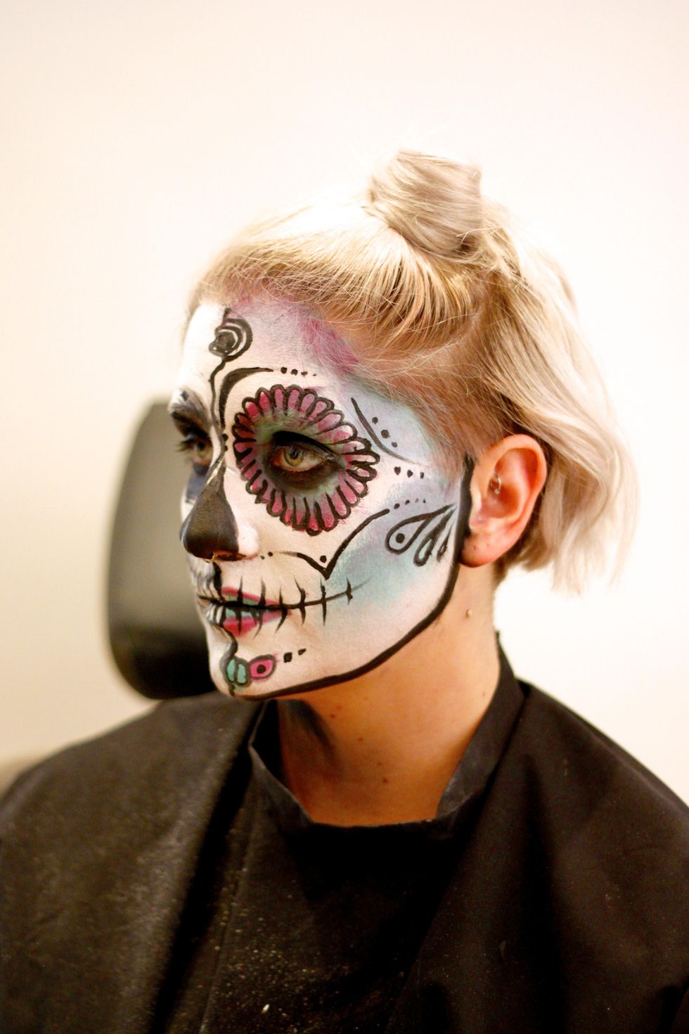 Sugar skull teeth are very stylized and neat compared this to the realistic-style skull we did on the left. Here's that guide: https://snapguide.com/guides/create-realistic-skull-makeup/