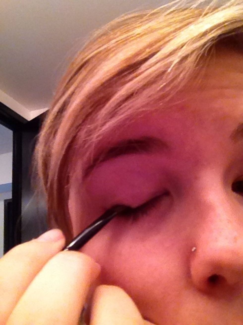 Angle your brush and sweep downward a few times UNDERNEATH the waterline about halfway. (Or a bit less for more natural)