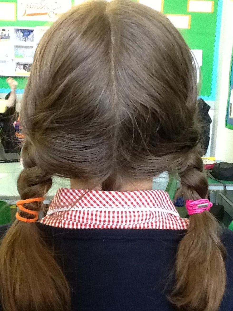 Brush the hair then split it into two partsPut one half over shoulder then split other into three bitsPut a bobble on the end That is one plait done repeat with the other side.Now you have got your plaits!