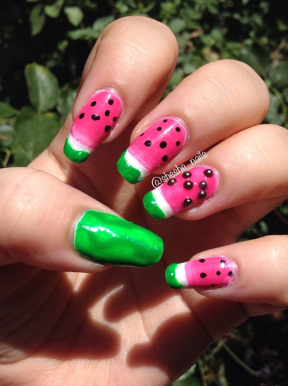 I'm doing the outside of the watermelon on my thumb. So I put a bunch of green polish on the makeup sponge and put it all over my thumb nail.