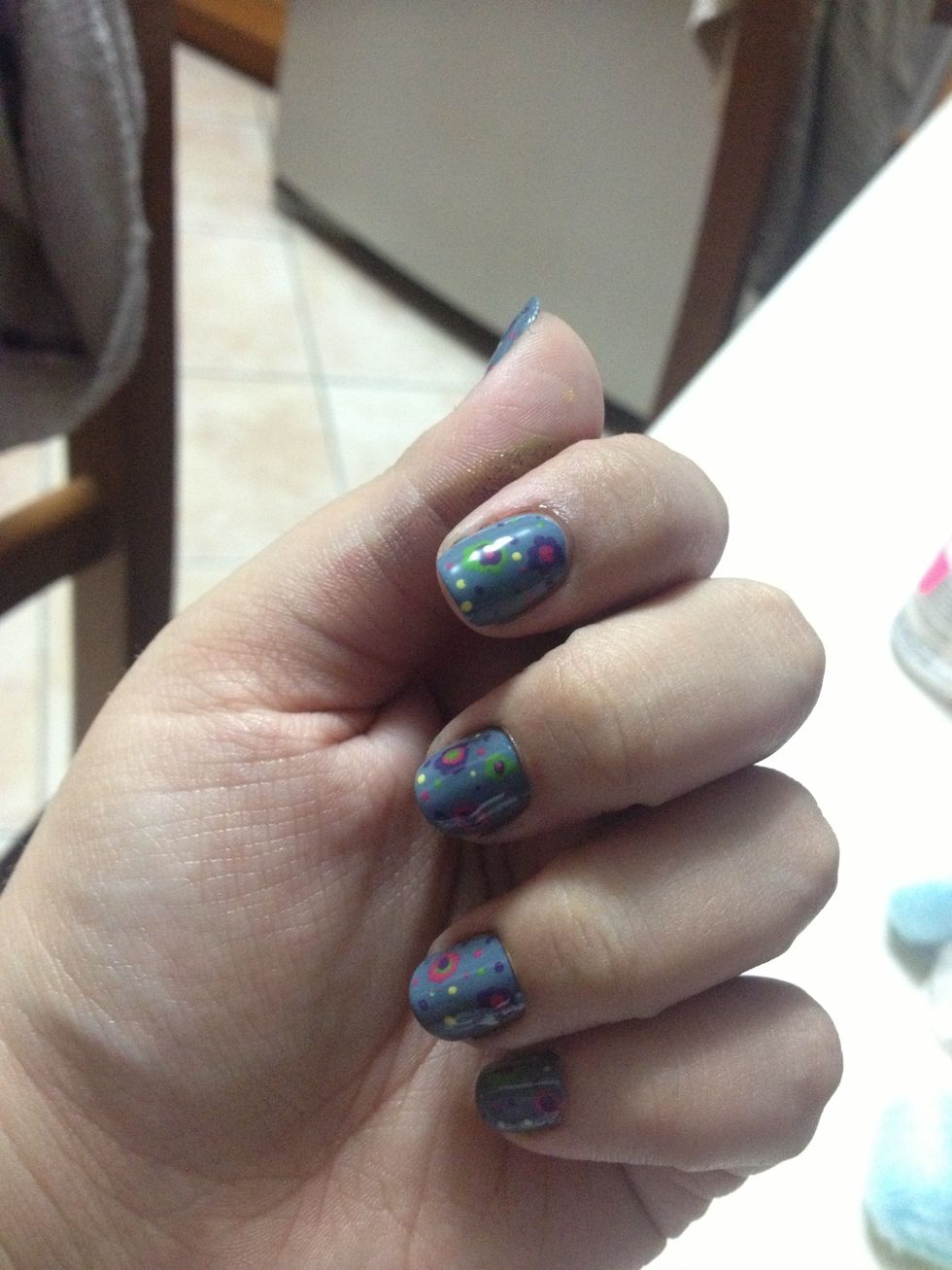 Fill the nail with another flower (or two, or three... Depending on how long your nail is...) and add some dots around it in multi-colors