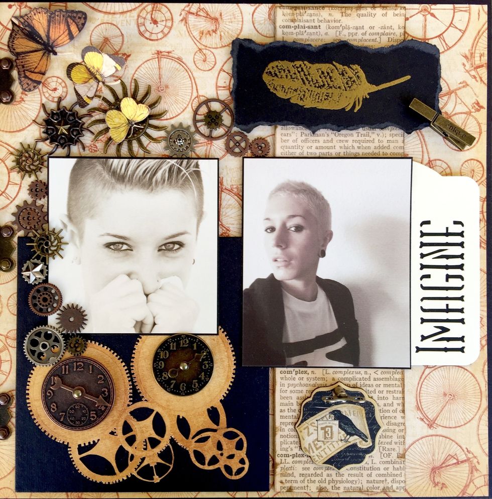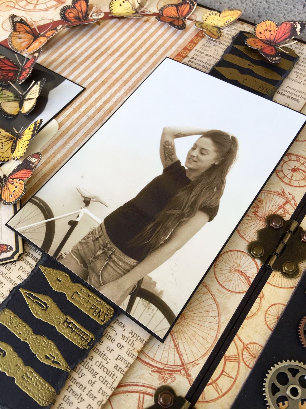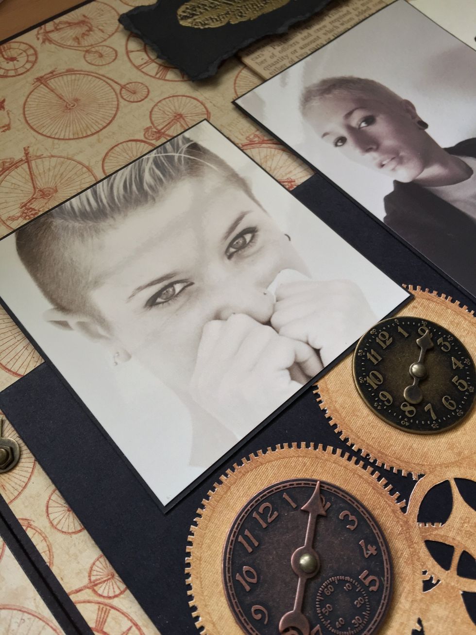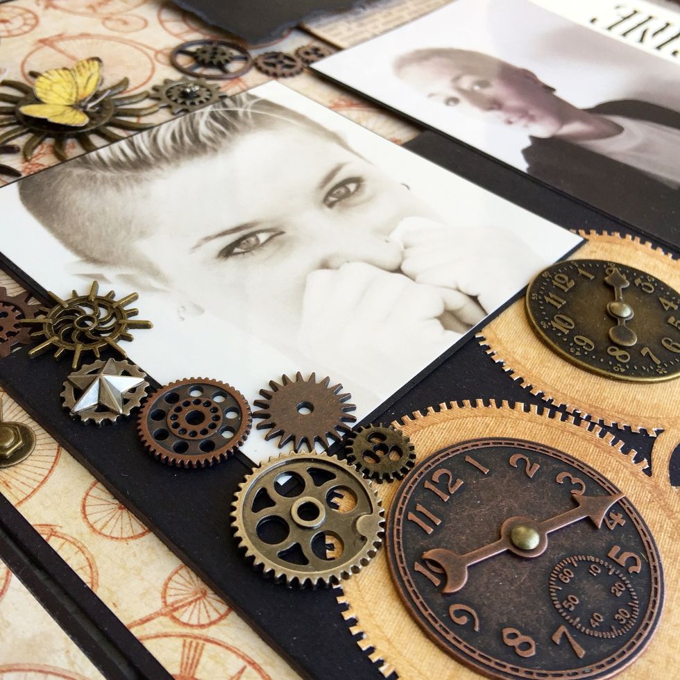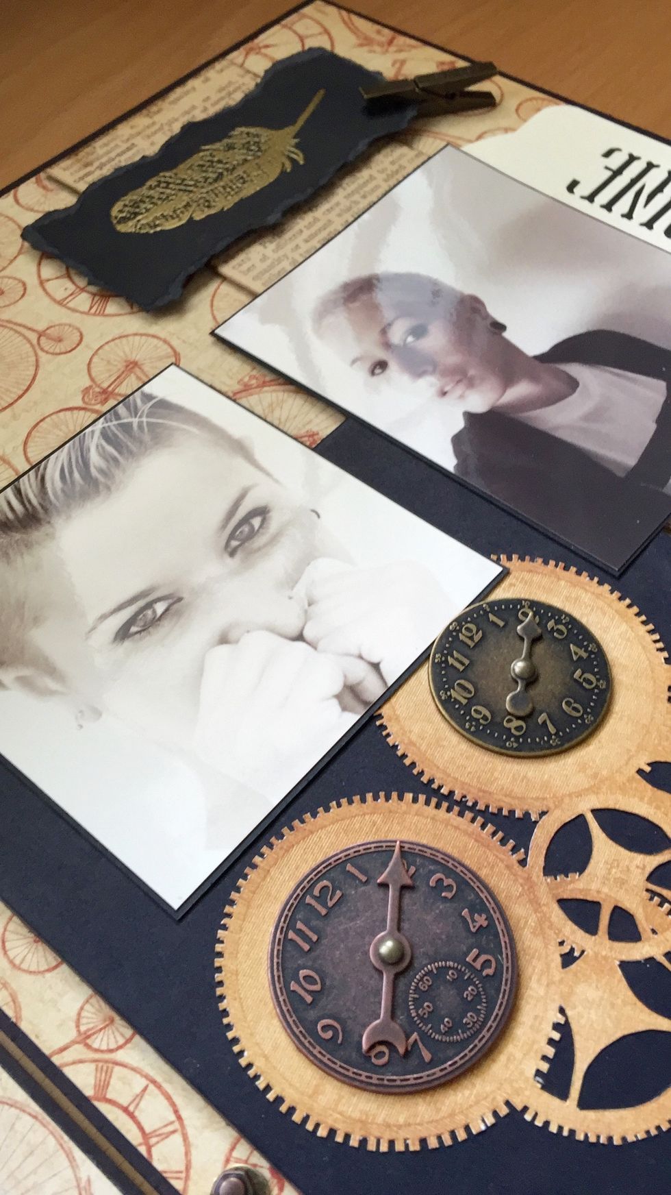 Glue the fussy cut gears and two clocks. Then use some double-sided tape to stick the photo on.