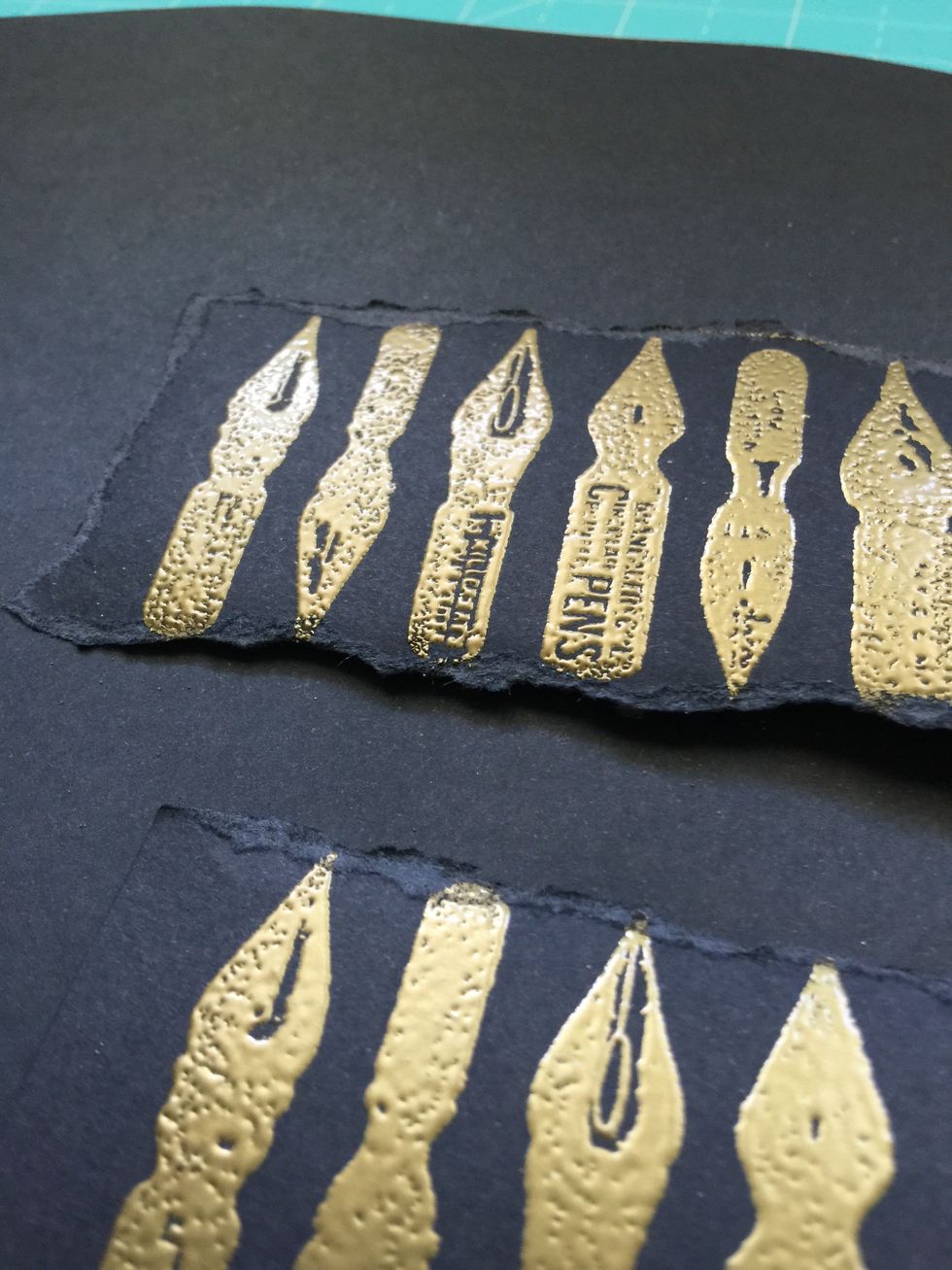 Rip come pieces of black cardboard. To make embossing we will need embossing stamp pad, stamps, embossing powder and a heat gun. Wet the stamp on the pad. Add embossing powder.