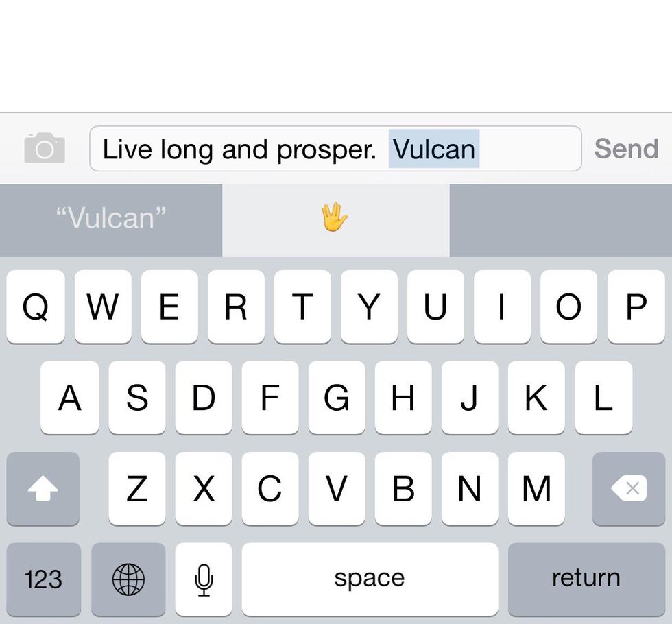 To use your new emoji shortcut in a message, start typing your shortcut's name and the 🖖 emoji will appear as recommended text and will auto-fill when you tap space or enter.
